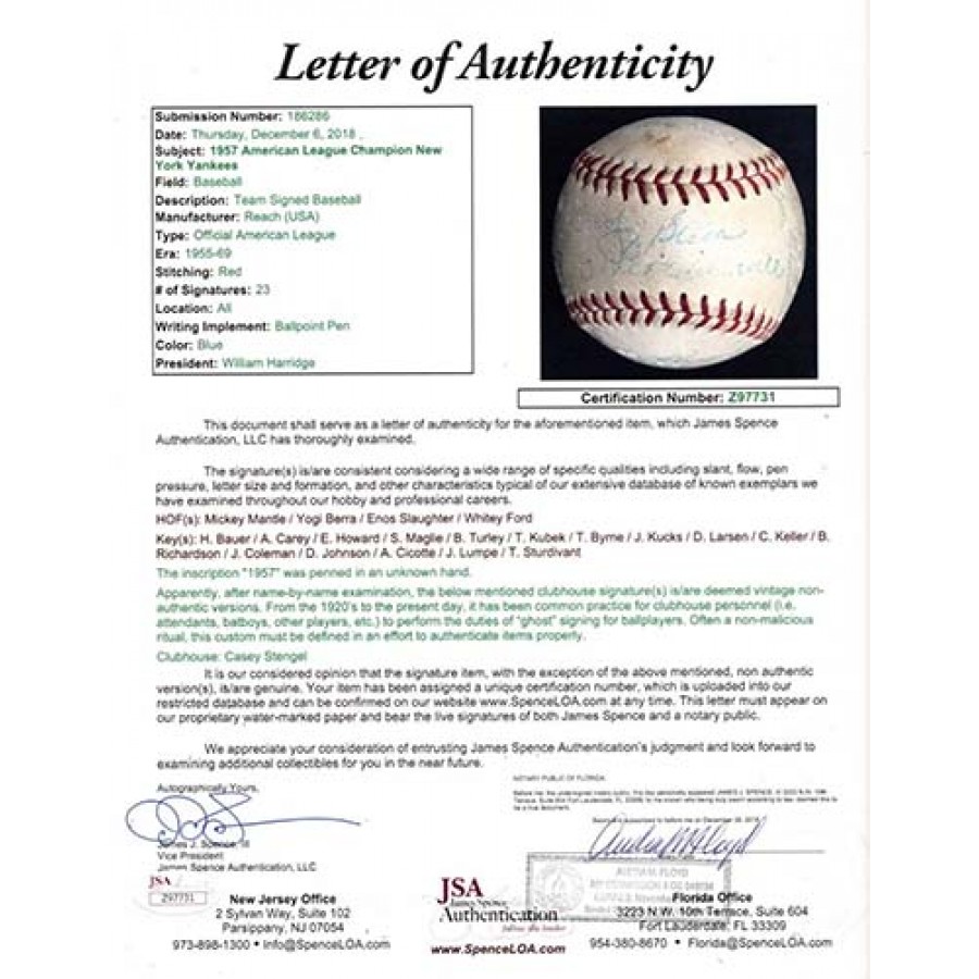 New York Yankees 1957 Team Signed Reach American League Baseball JSA Authentic