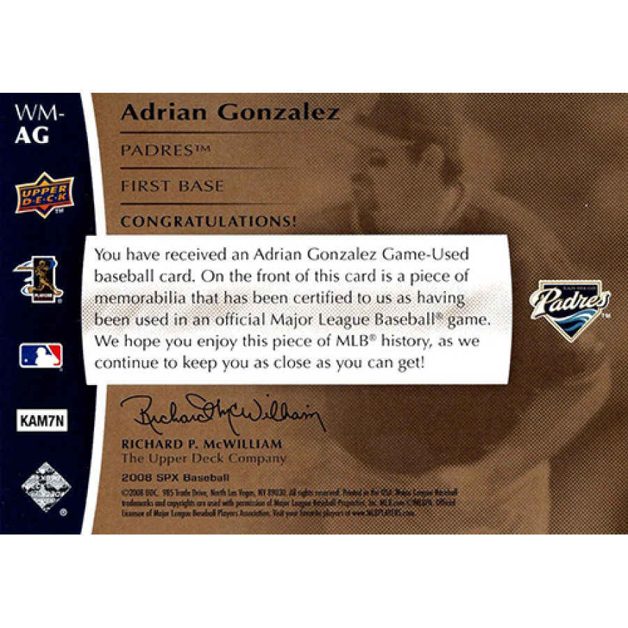 Adrian Gonzalez San Diego Padres 2008 SPX Winning Materials Card #WM-AG /125