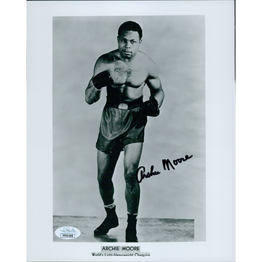 Signed Archie Moore 8x10 glossy photo in black sharpie. This item has been certified by James Spence Authentication (JSA) and will come with a sticker on the item and matching card.