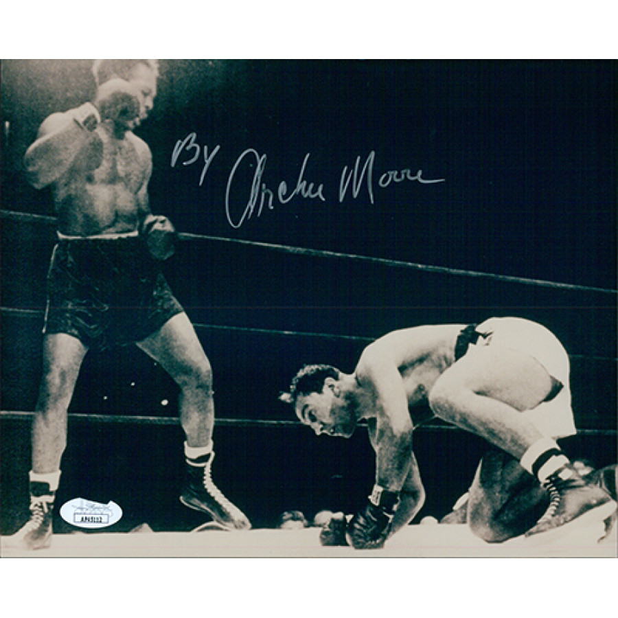 Signed Archie Moore 8x10 glossy finish photo in silver sharpie. This item has been certified by James Spence Authentication (JSA) and will come with a sticker on the item and matching card.