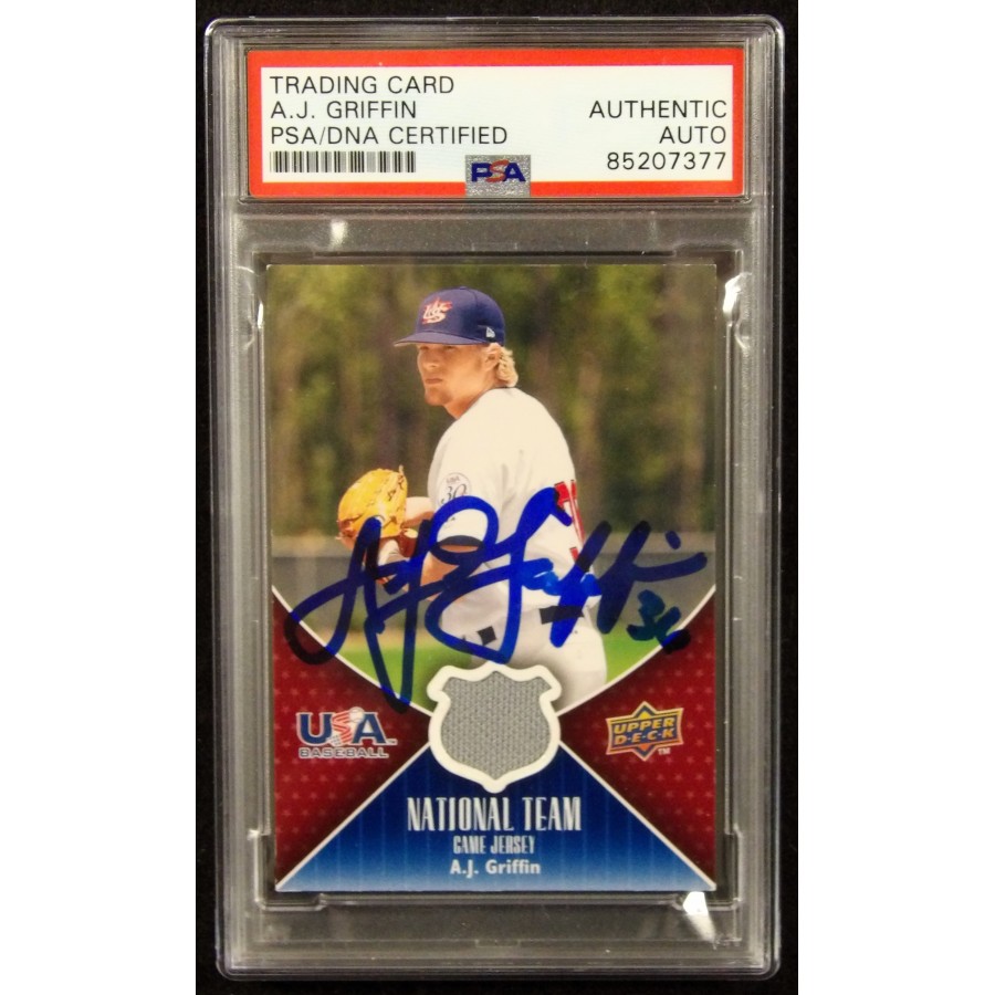 Signed A.J. Griffin 2009 Upper Deck USA Baseball National Team relic baseball card #USA-AG in blue sharpie. This item is certified by Professional Sports Authenticator (PSA) encapsulated.