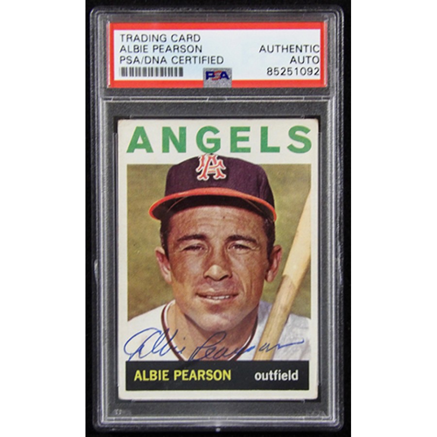 Signed Albie Pearson Los Angeles Angels 1964 Topps Baseball Card #110 in blue ink. This item is certified by Professional Sports Authenticator (PSA) encapsulated.