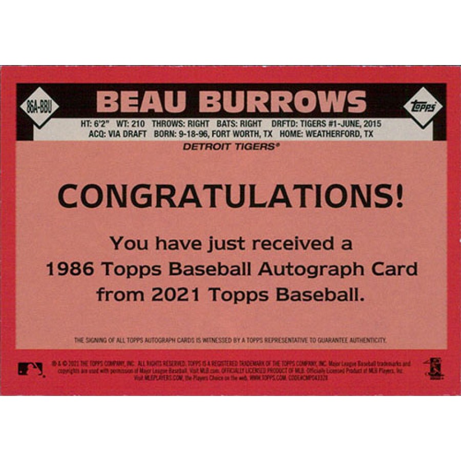 Beau Burrows Signed 2021 Topps Series 1 1986 35th Anniversary Baseball Card #86A-BBU.