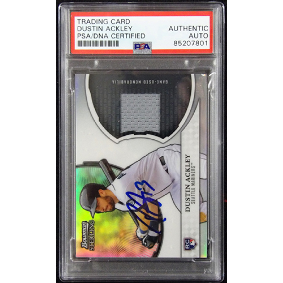 Signed Dustin Ackley Seattle Mariners 2011 Topps Bowman Sterling refractor relic baseball card #RRR-DA in blue sharpie. This item is certified by Professional Sports Authenticators (PSA) encapsulated.