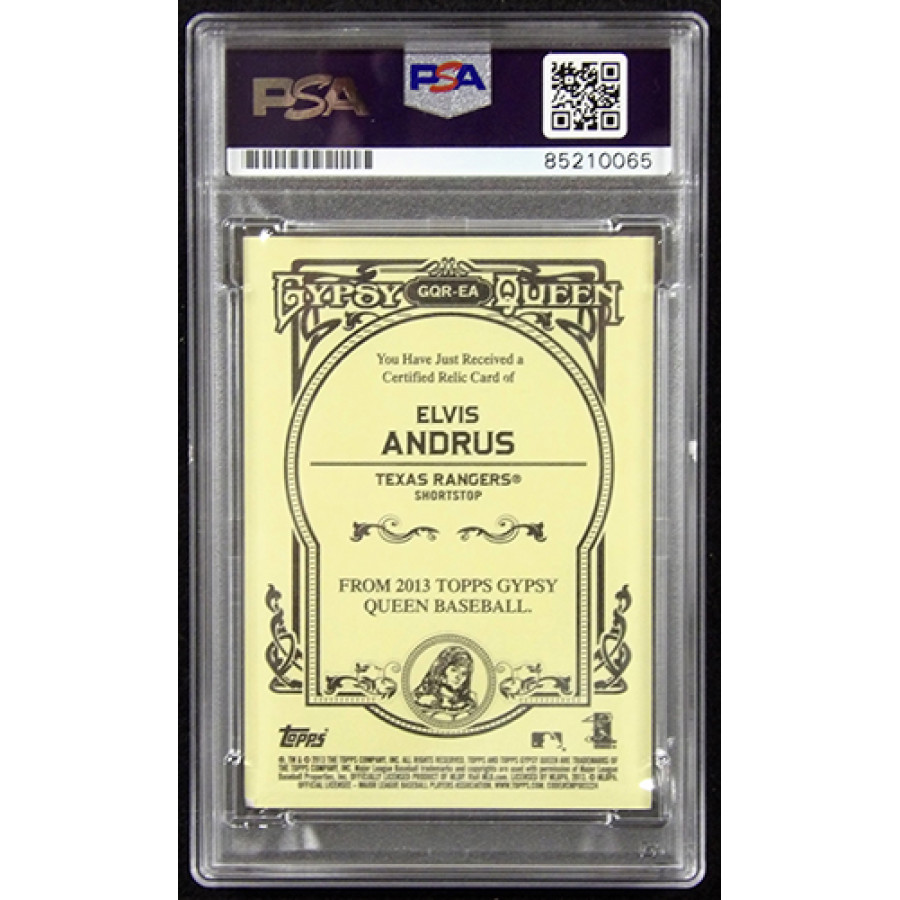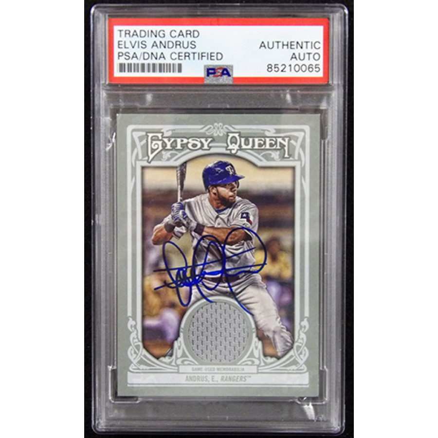 Signed Elvis Andrus Texas Rangers 2013 Topps Gypsy Queen Relic baseball card #GQR-EA in blue sharpie. This item is certified by Professional Sports Authenticators (PSA) encapsulated.