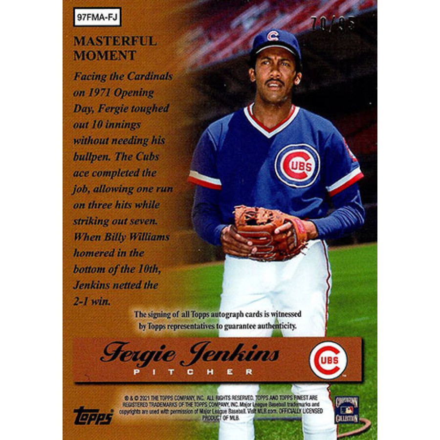 Signed Ferguson Jenkins Chicago Cubs 2021 Topps Finest Masters Baseball Card #97FMA-FJ in blue ink. This is numbered 70 of 95.