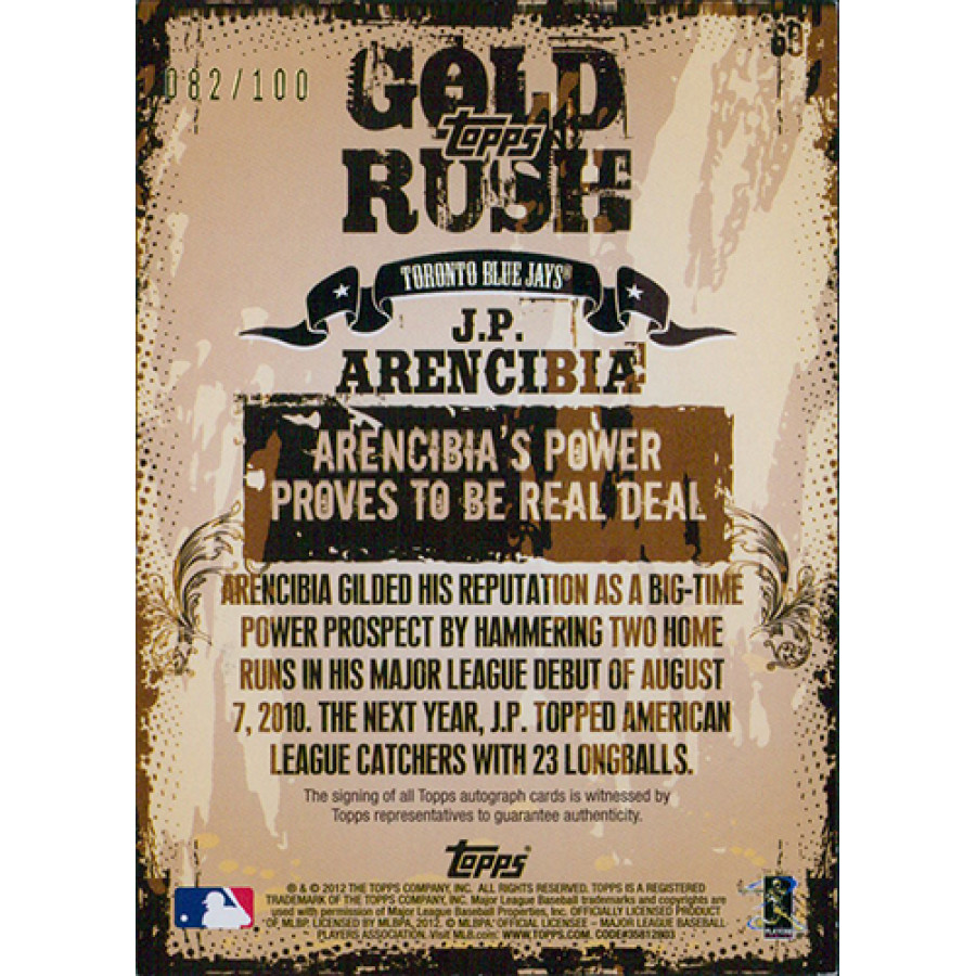 JP Arencibia Toronto Blue Jays Signed 2012 Topps Gold Rush Baseball Card #69. This is numbered 82 of 100.