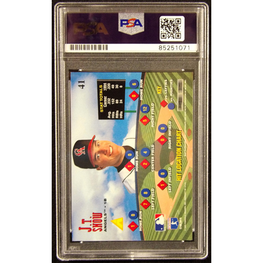 Signed J.T. Snow California Angels 1995 Pinnacle Zenith Edition Baseball Card #41 in blue ink. This item is certified by Professional Sports Authenticator (PSA) encapsulated.