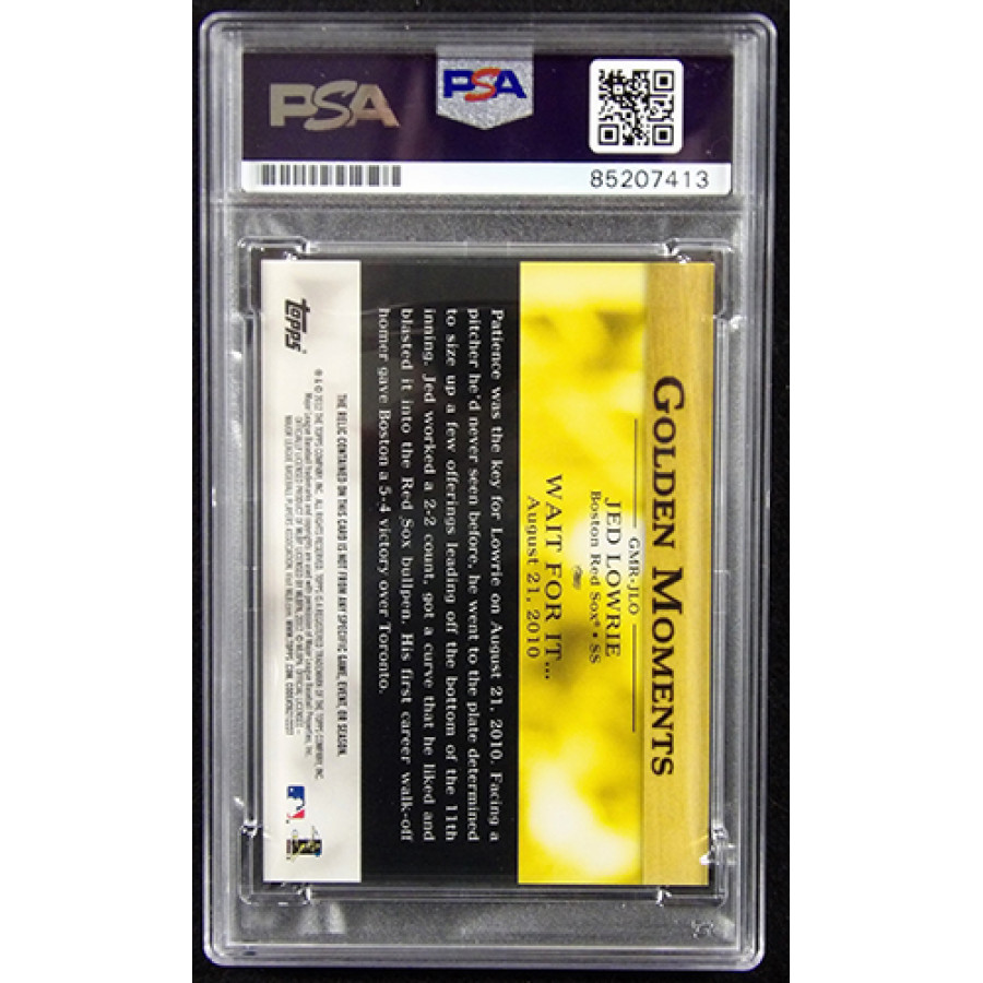 Signed Jed Lowrie Boston Red Sox 2012 Topps Golden Moments relic baseball card #GMR-JLO in blue sharpie. The card is numbered 75 of 99. This item is certified by Professional Sports Authenticator (PSA) encapsulated.