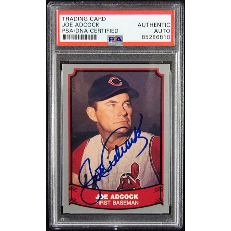 Signed Joe Adcock Cleveland Indians 1988 Pacific Baseball Card #31 in blue sharpie. This item is certified by Professional Sports Authenticator (PSA) encapsulated.