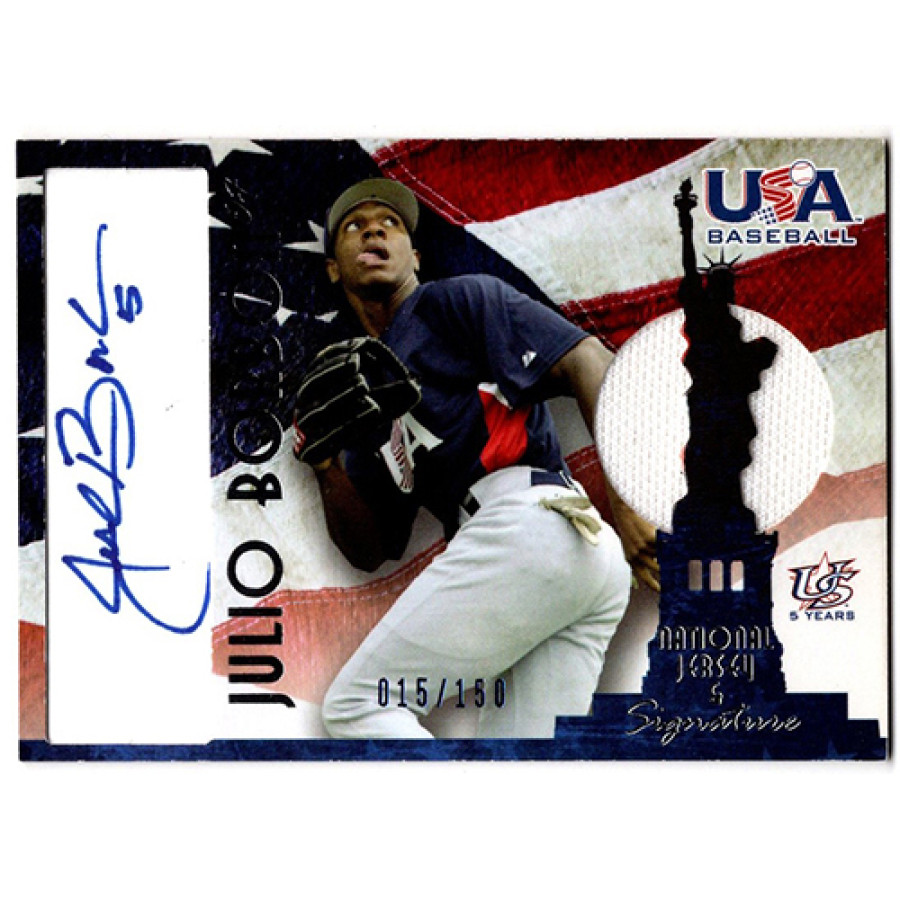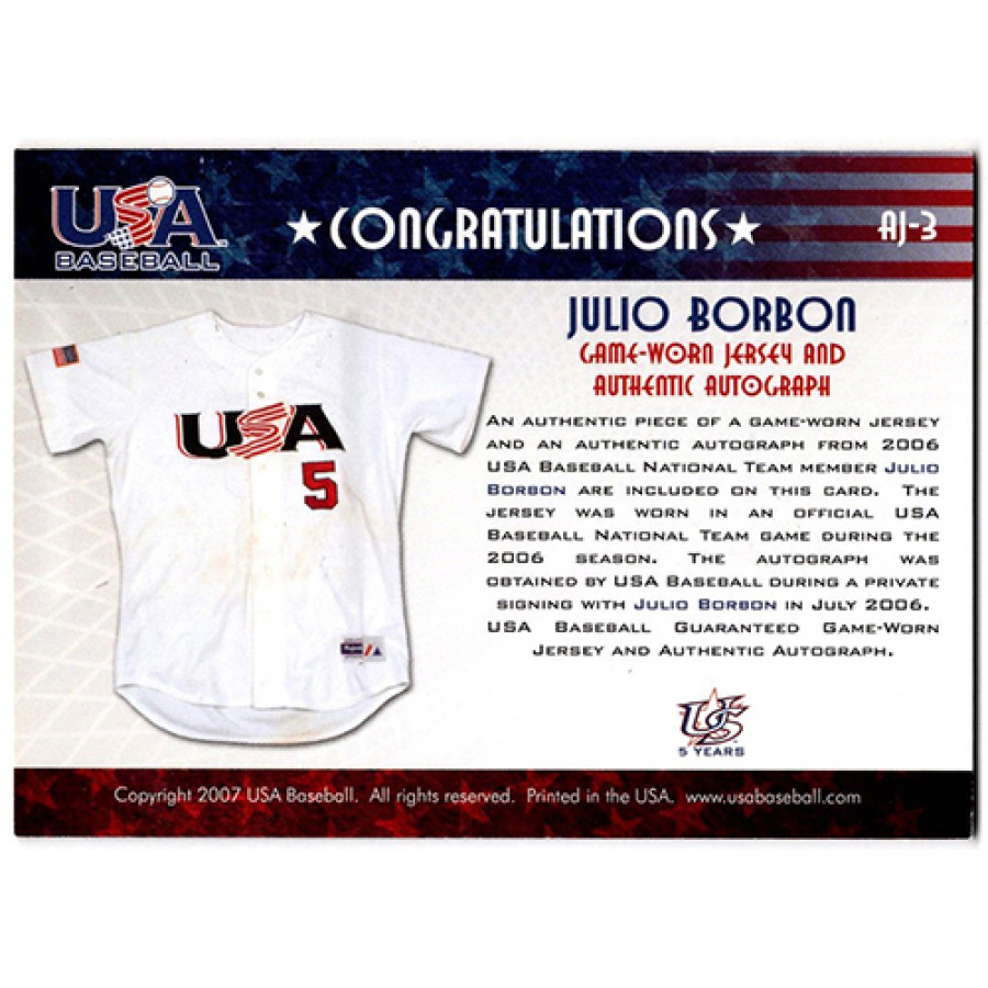 Signed Julio Borbon 2007 USA Baseball National Jersey and Signature baseball card #AJ-3. This is numbered 15 of 150.