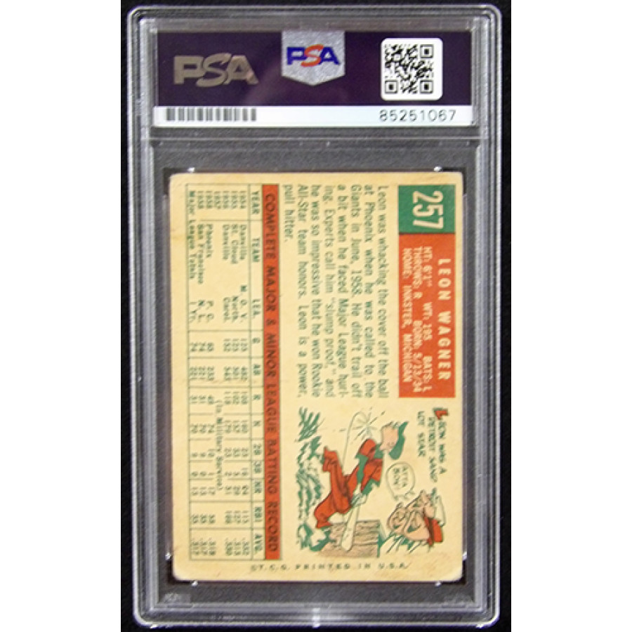 Signed Leon Wagner San Francisco Giants 1959 Topps Baseball Card #257 in blue ink. This item is certified by Professional Sports Authenticator (PSA) encapsulated.