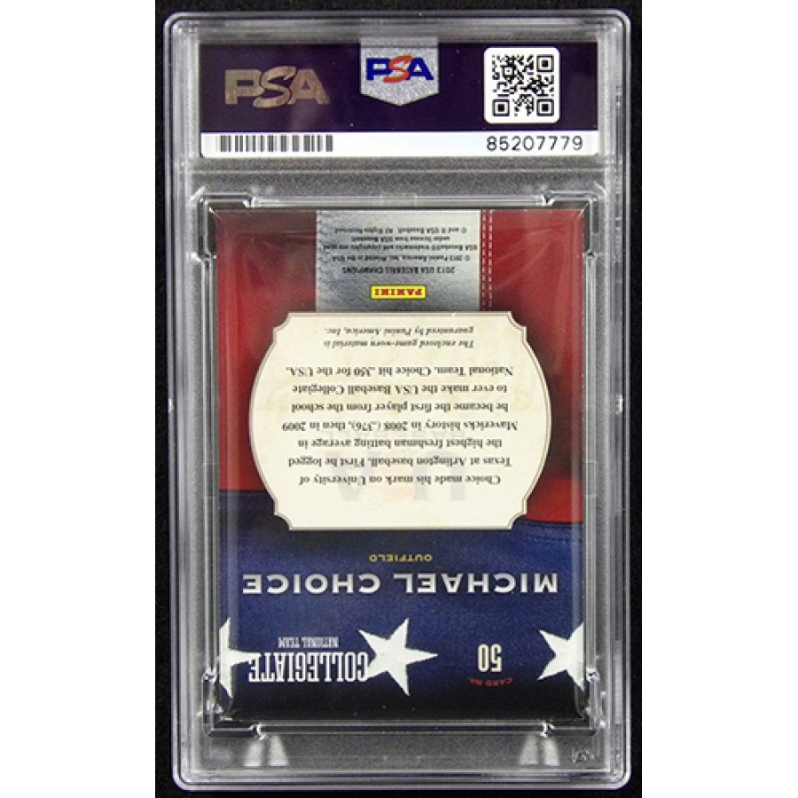 Signed Michael Choice 2013 Panini USA Baseball Champions Game Gear relic baseball card #50 in blue sharpie. This item is certified by Professional Sports Authenticator (PSA) encapsulated.