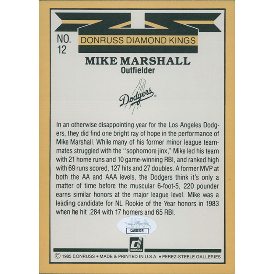 Signed Mike Marshall Los Angeles Dodgers 1986 Donruss Diamond Kings Jumbo 5x7 baseball card #13 in blue ink. The signature is light. This item is certified by James Spence Authentication (JSA) with sticker affixed to item and matching card.