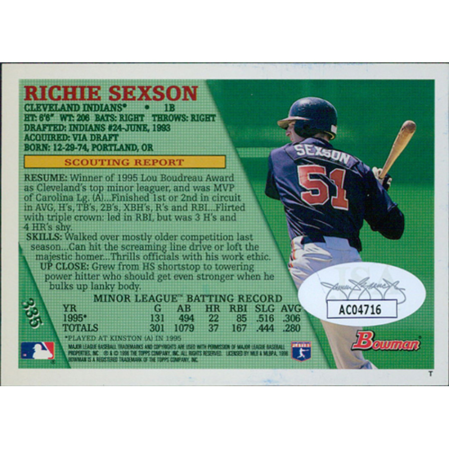 Signed Richie Sexson Cleveland Indians 1996 Bowman Baseball Card #335 in blue sharpie. This item is certified by James Spence Authentication (JSA) with sticker affixed to item and matching card.