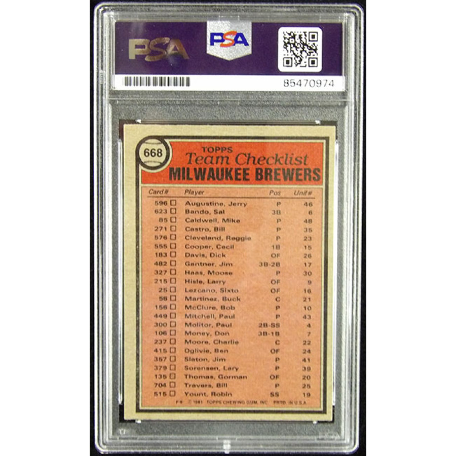 Signed Robin Yount Milwaukee Brewers 1981 Topps Baseball Card #668 in blue ink. This item is certified by Professional Sports Authenticator (PSA) encapsulated.