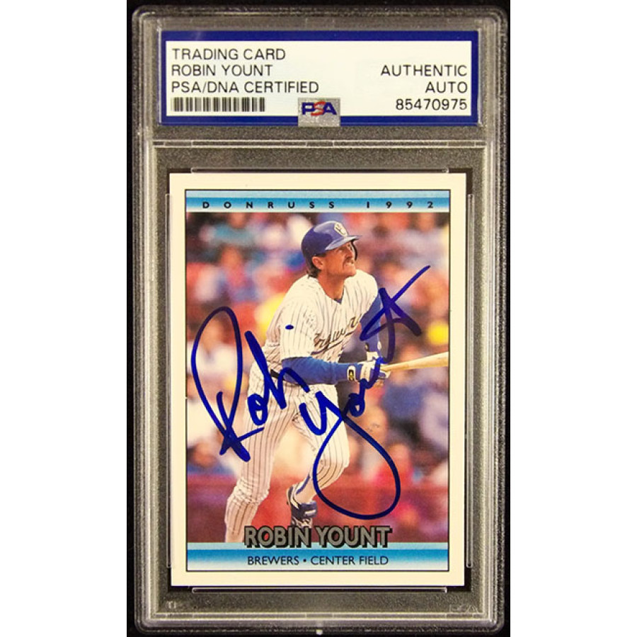 Signed Robin Yount Milwaukee Brewers 1992 Donruss Baseball Card #173 in blue sharpie.  This item is certified by Professional Sports Authenticator (PSA) encapsulated.