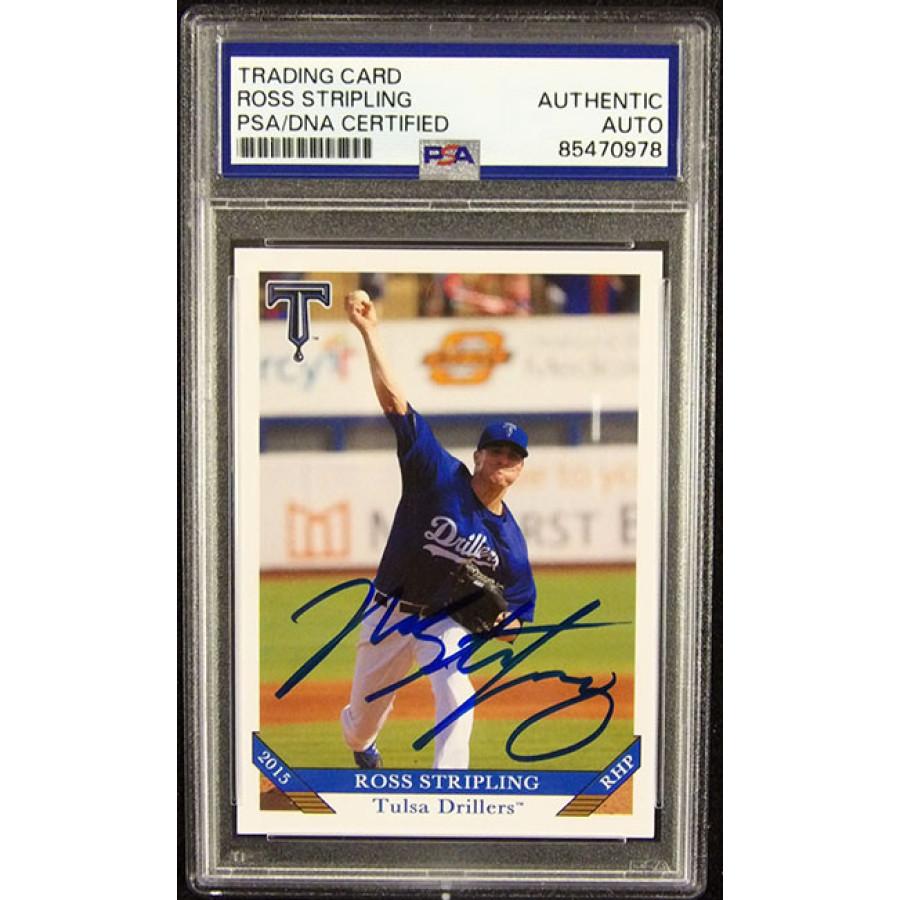 Signed Ross Stripling Tulsa Drillers 2015 Grandstand Baseball Card #21 in blue sharpie. This item is certified by Professional Sports Authenticator (PSA) encapsulated.
