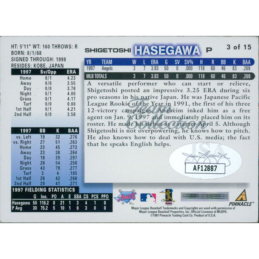 Signed Shigetoshi Hasegawa Anaheim Angels 1997 Pinnacle Score Baseball Card #3 in black pen. There is some dirt marks and soft corners. This item is certified by James Spence Authentication (JSA) with sticker affixed to item and matching card.