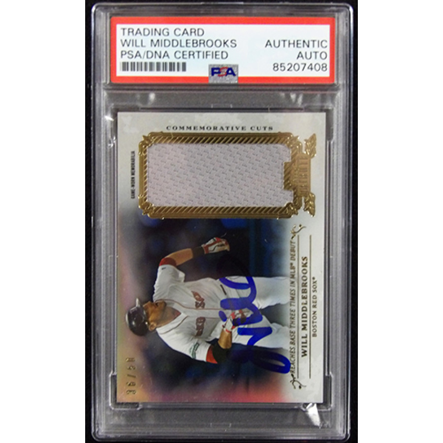Signed Will Middlebrooks Boston Red Sox 2013 Topps Tribute Commemorative Cuts relic baseball card #CC-WMI in blue sharpie. This is numbered 36 of 50. This item is certified by Professional Sports Authenticators (PSA) encapsulated.