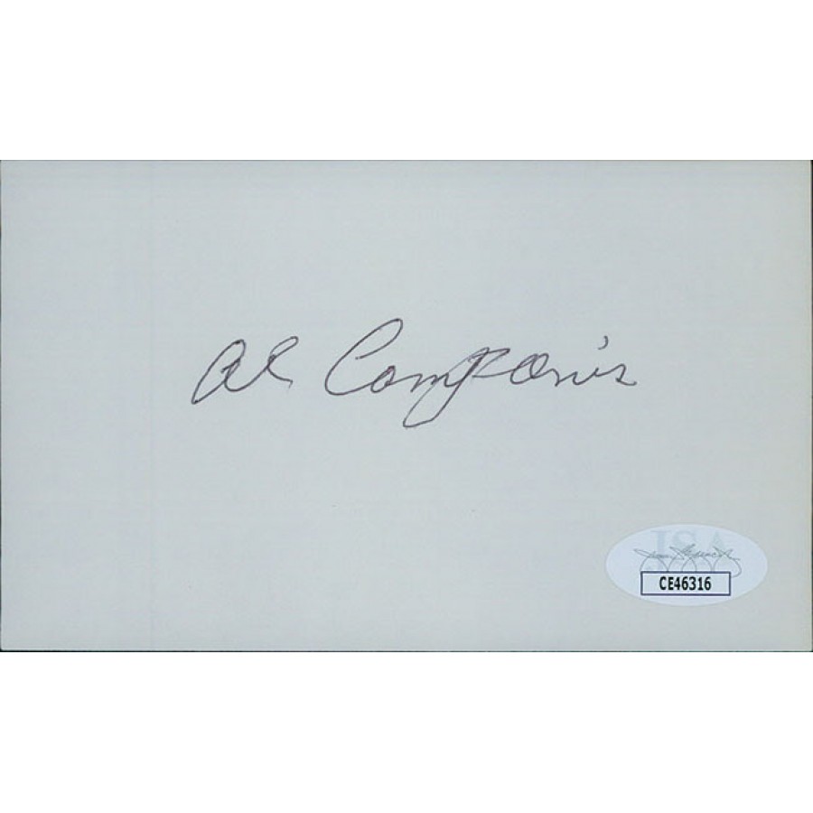 Signed Al Campanis 3x5 index card in black ink. This item has been certified by James Spence Authentication (JSA) with sticker on item and matching card.