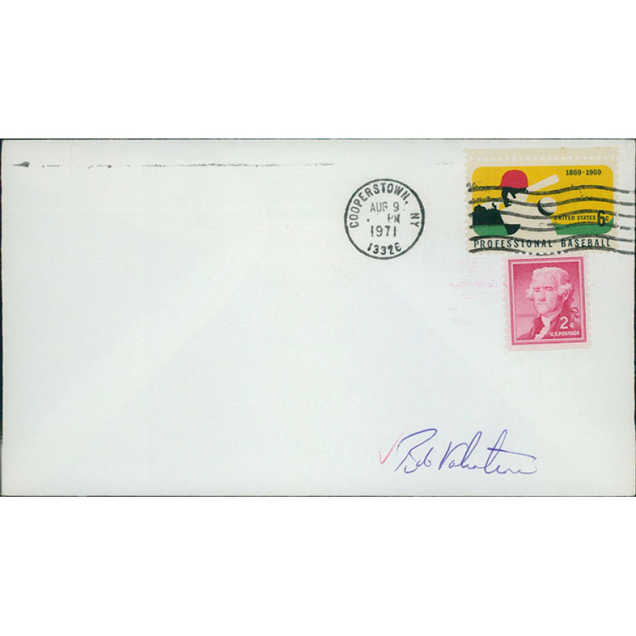 Signed Bobby Valentine Envelope Cachet in blue pen. There is writing on the back. This item has been certified by James Spence Authentication (JSA) with sticker on item and matching card.