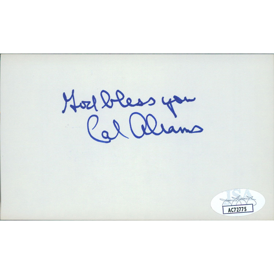 Signed Cal Abrams 3x5 Index Card in blue sharpie. This item has been certified by James Spence Authentication (JSA) with sticker affixed to item and matching card.