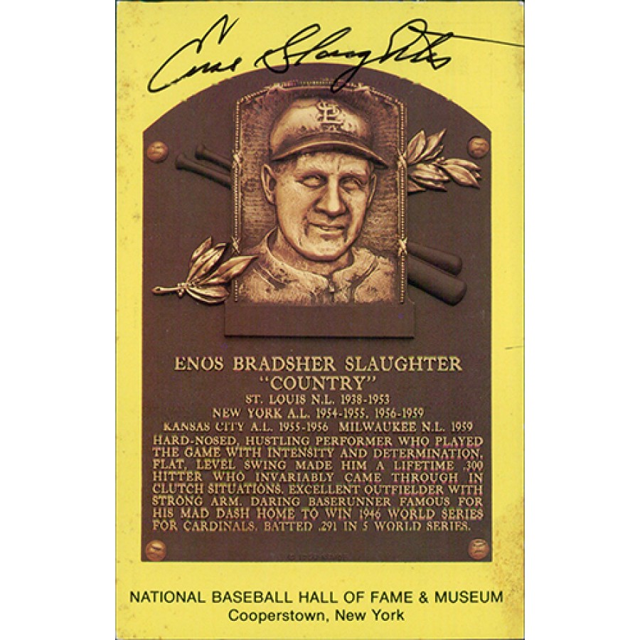 Signed Enos Slaughter Yellow Hall of Fame plaque postcard in black ink. There is some dirt around the edges. This item has been certified by James Spence Authentication (JSA) and will come with a sticker on the item and matching card.