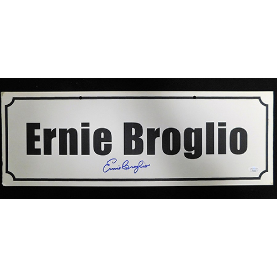 Signed Ernie Broglio 7x20 name plate sign from the 2005 National in blue sharpie. The boarders show wearing with dented corners and creases. This item has been certified by James Spence Authentication (JSA) with sticker on item and matching card.