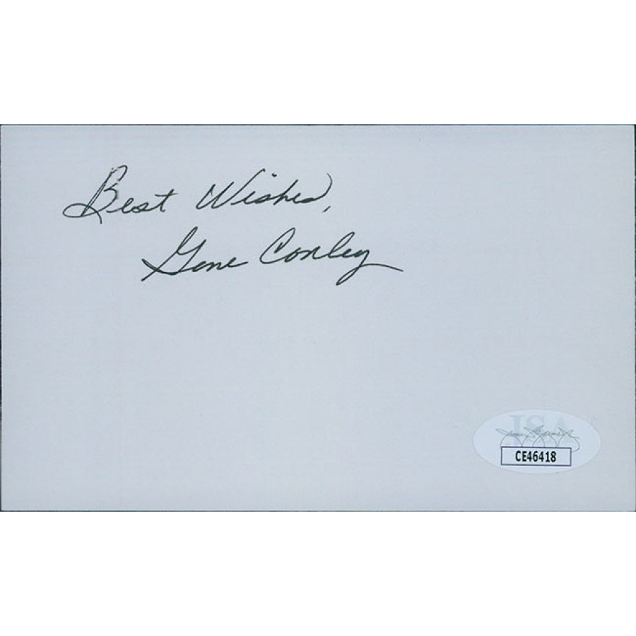 Signed Gene Conley 3x5 index card in black ink. This item has been certified by James Spence Authentication (JSA) with sticker on item and matching card.