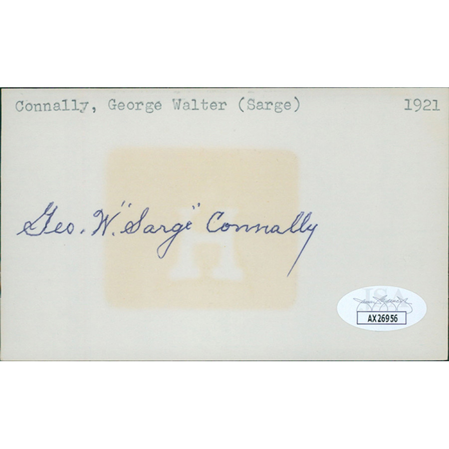 Signed George Sarge Connally 3x5 Index Card in blue ink. This item has been certified by James Spence Authentication (JSA) with sticker affixed to item and matching card.