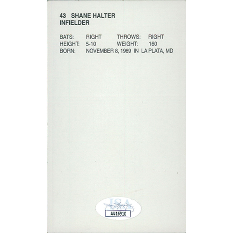 Signed Shane Halter Kansas City Royals 3x5 Photo Card in blue sharpie. This item has been certified by James Spence Authentication (JSA) with sticker affixed to item and matching card.