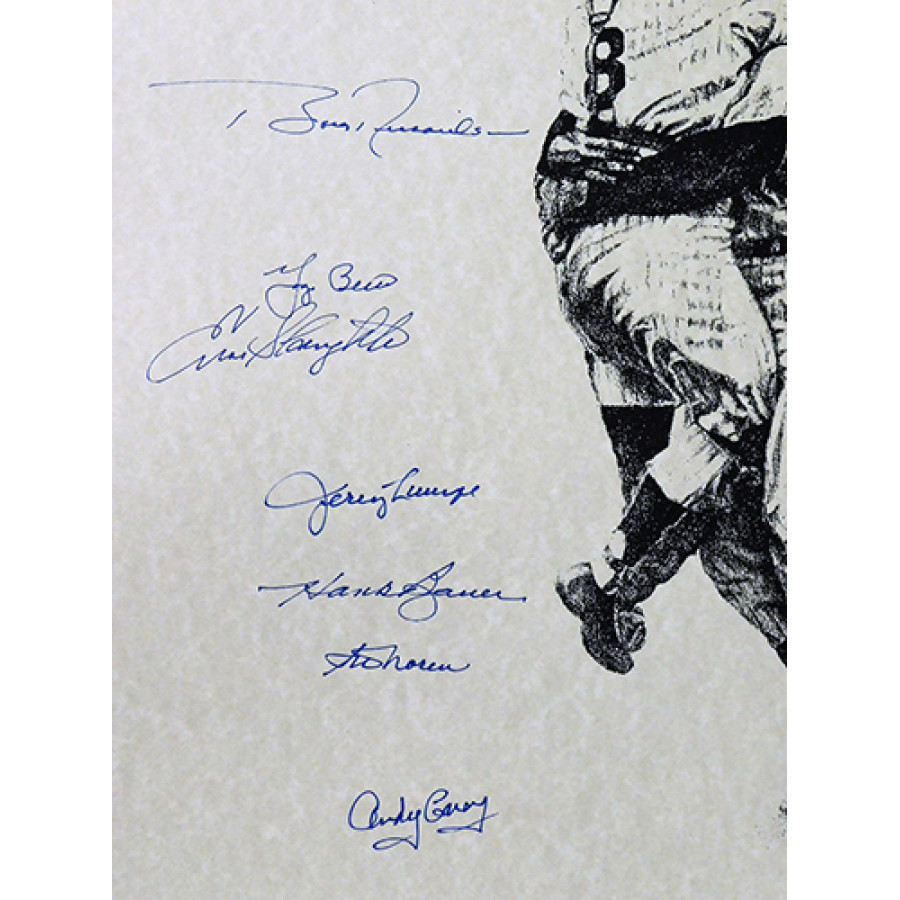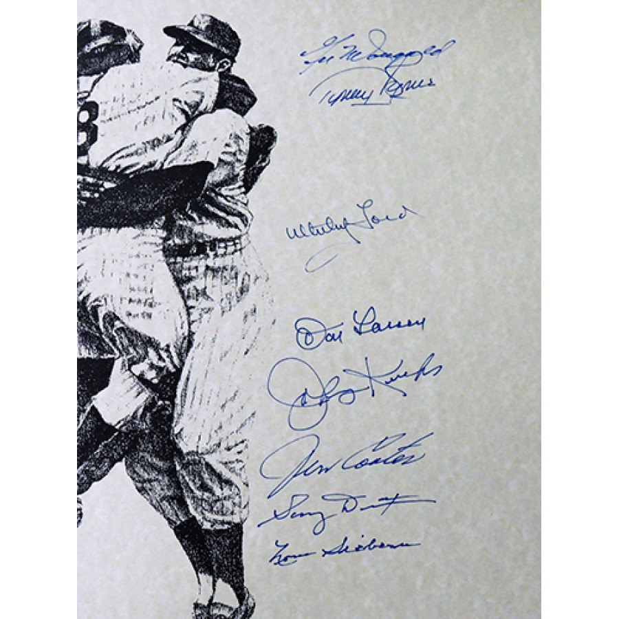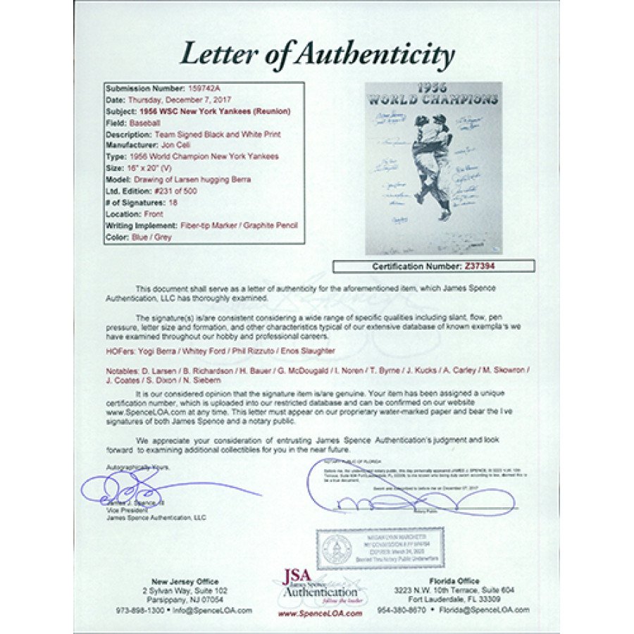 Signed 1956 World Champions New York Yankees 16x20 lithograph by 17 players. The players include Yogi Berra, Whitey Ford, Phil Rizzuto, Enos Slaughter, Don Larsen, Bobby Richardson, Hank Bauer, Gil McDougal, Irv Noren, Tommy Byrne, Johnny Kucks, Andy Carey, Bill Skowron, Jim Coates, Sonny Dixon and Norm Siebern. It is also autographed and numbered  to 500 by the artist. This item has been certified by James Spence Authentication (JSA) and will come with a sticker on the item and matching letter.