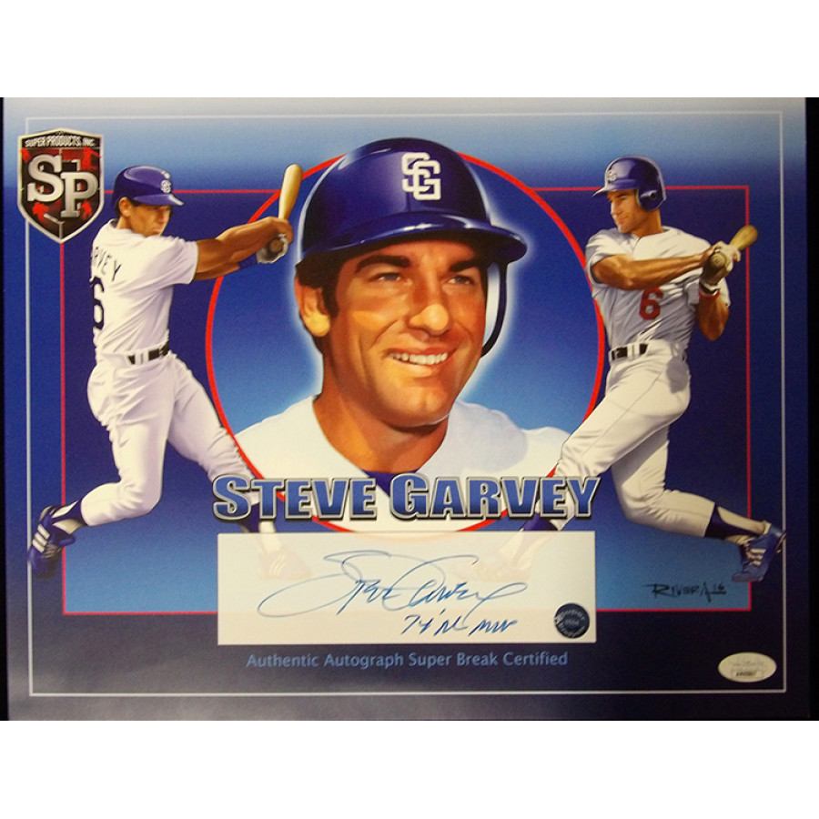 Signed Steve Garvey Los Angeles Dodgers 11x14 cardstock photo in blue ink with "74' NL MVP" inscription. This item has been certified by James Spence Authentication (JSA) and will come with a sticker on the item and matching card.