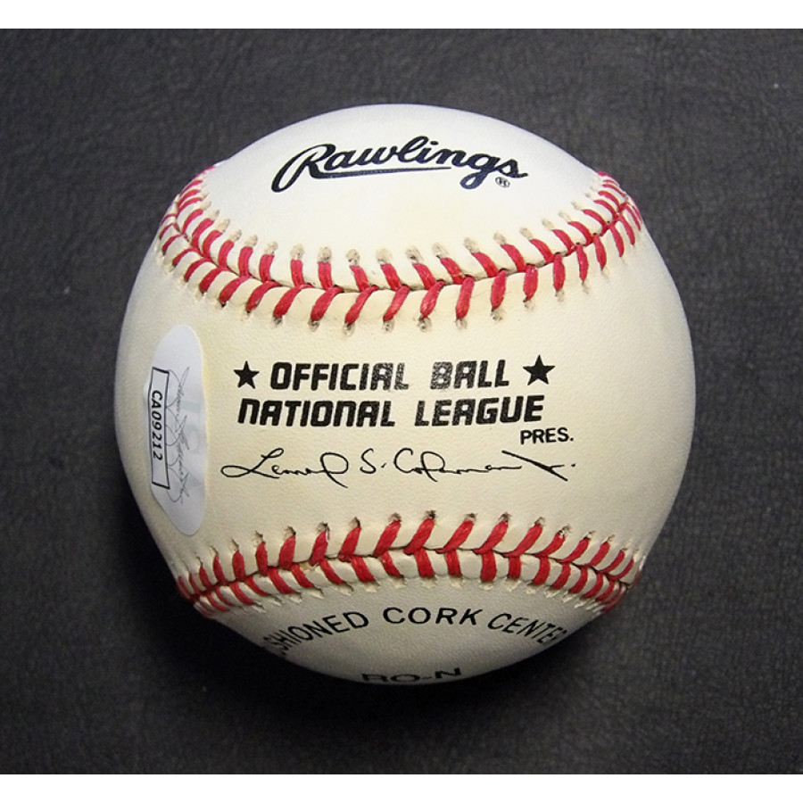 Signed Doug Harvey Rawlings Official National League Baseball in blue pen on the sweet spot with "N.L. upm." Inscription. The ball has some light toning/spotting marks to it. This item has been certified by James Spence Authentication (JSA) with sticker affixed to item and matching card.