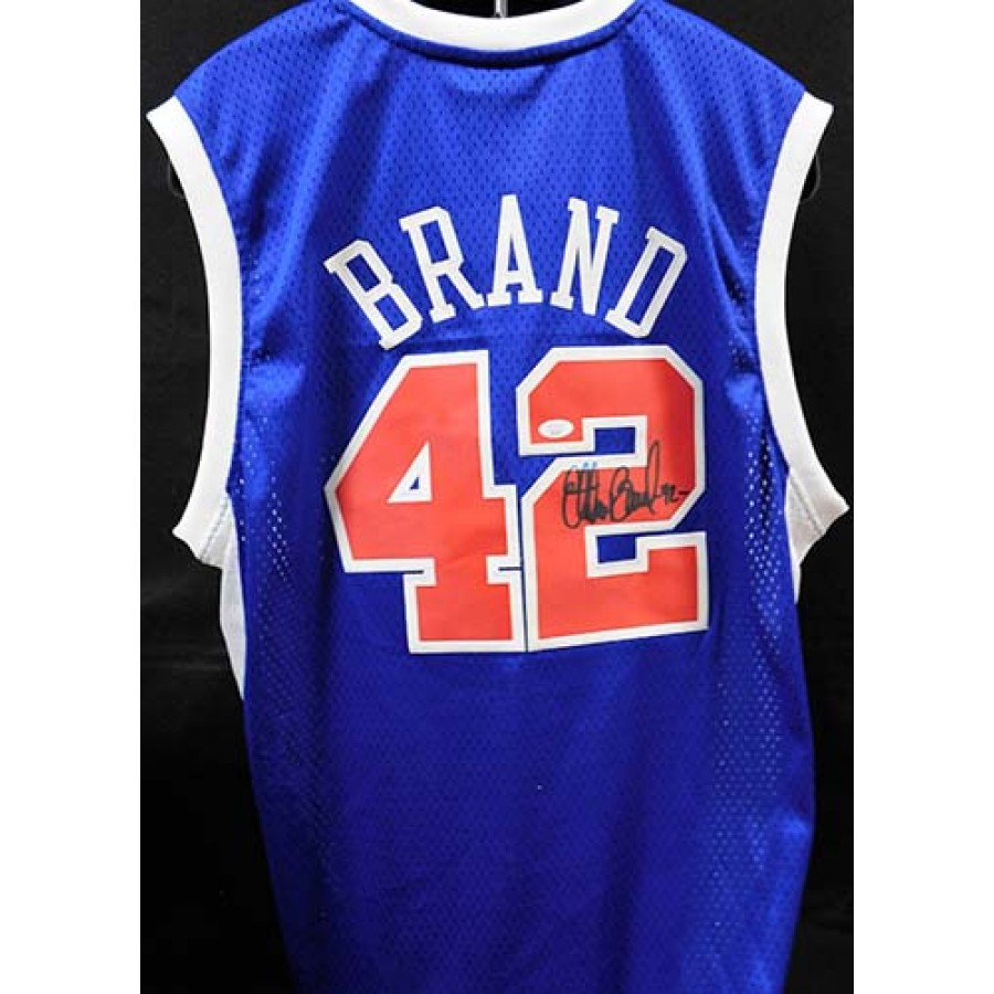 Signed Elton Brand Los Angeles Clippers replica jersey size XL in blue sharpie on the back number. This item is certified by James Spence Authentication (JSA) with sticker affixed to item and matching card.