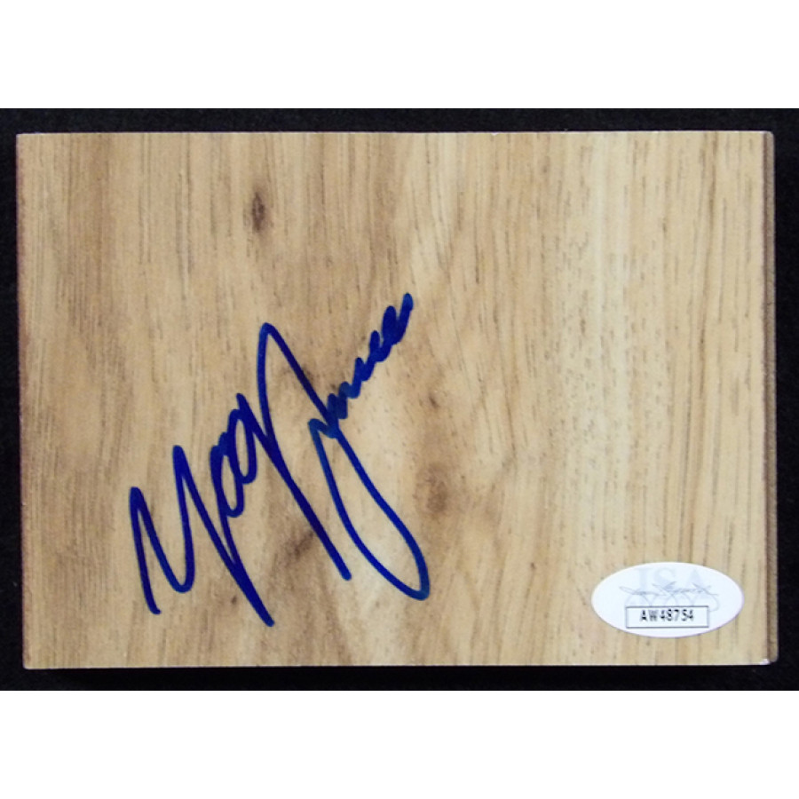 Signed Yogi Ferrell 3.5x5 floorboard in blue sharpie. This item is certified by James Spence Authentication (JSA) with sticker affixed to item and matching card.
