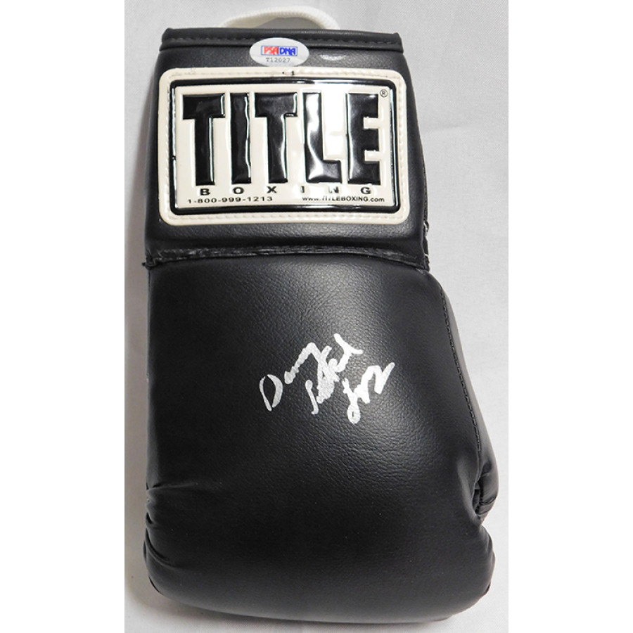 Signed Danny Little Red Lopez Title Black Boxing Glove in silver sharpie. There is some scuffing on the the end of the glove and has been covered up by a marker. This item has been certified by Professional Sport Authenticator (PSA) and will come with a sticker on the item and matching card.