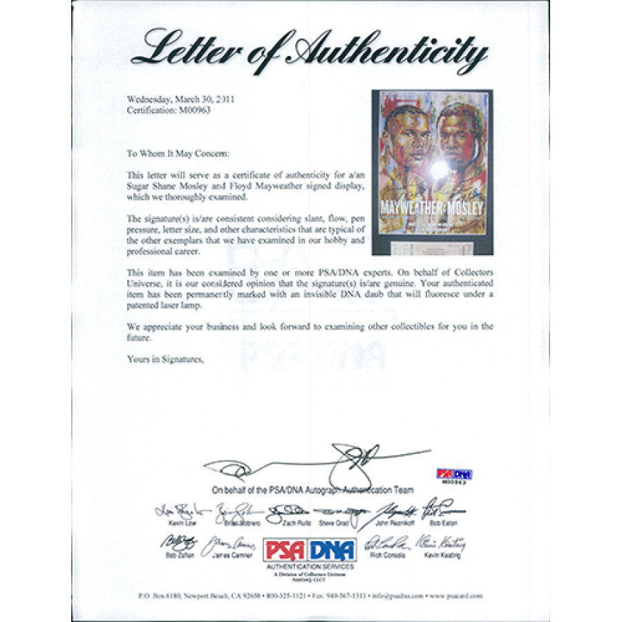 Signed Floyd Mayweather Jr. and Sugar Shane Mosley matted program in black sharpie by both with tickets. The matte measures 10.75x19 inches. This item has been certified by Professional Sport Authenticator (PSA) and will come with letter of authenticity twice.