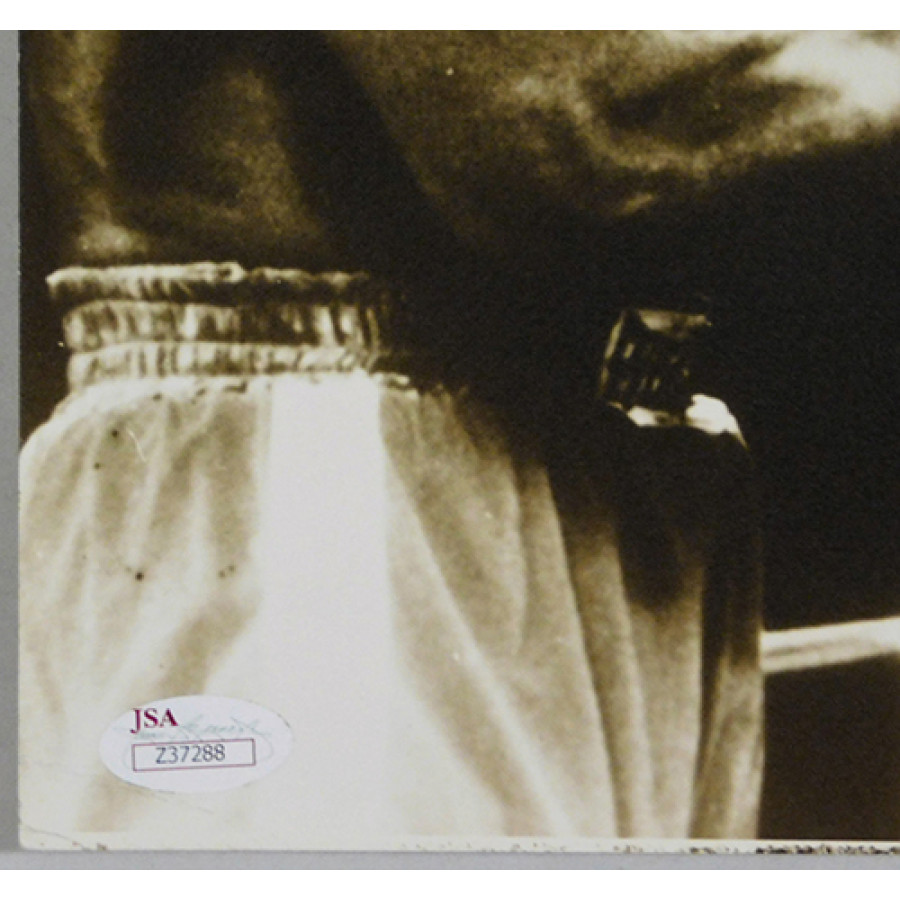 Signed Muhammad Ali 11x14 cardstock sepia photo in black sharpie. There is some creases in the bottom left corner near the certification sticker. There is also a crease to the right middle side. This item has been certified by James Spence authentication (JSA) with sticker affixed to item and matching letter of authenticity.