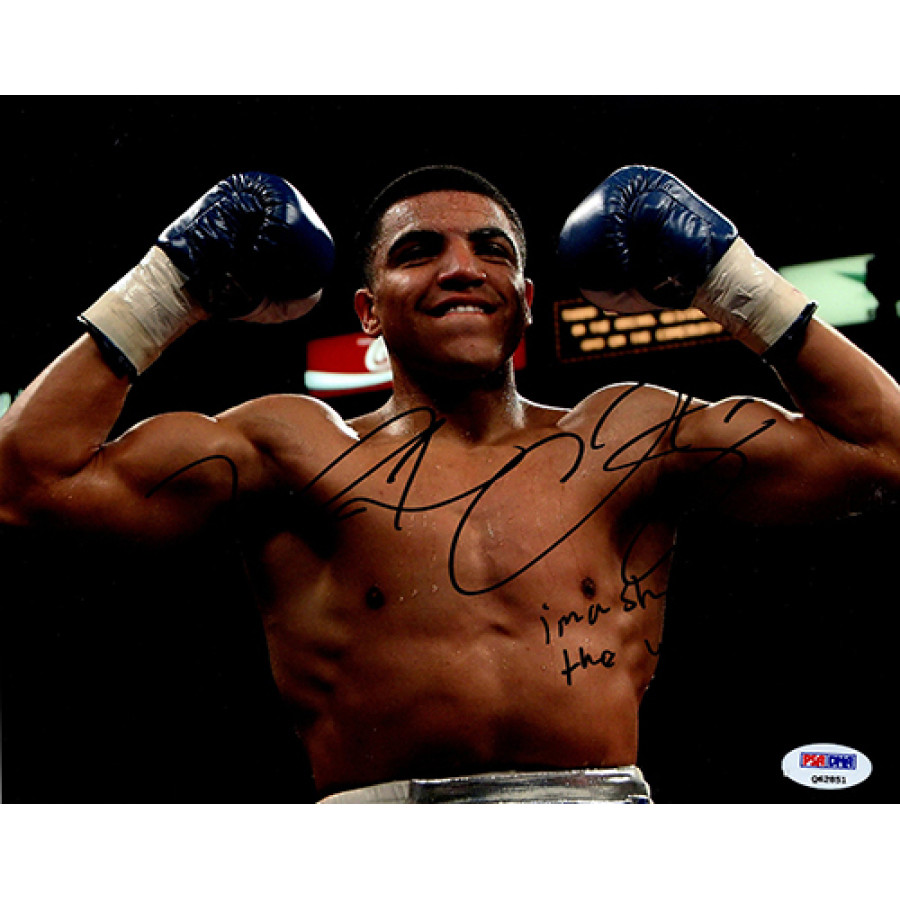 Signed Victor Ortiz 8x10 matte finish cardstock photo in black sharpie with "Ima shock the world" inscription. This item has been certified by Professional Sports Authenticator (PSA) with sticker affixed to item and matching card.