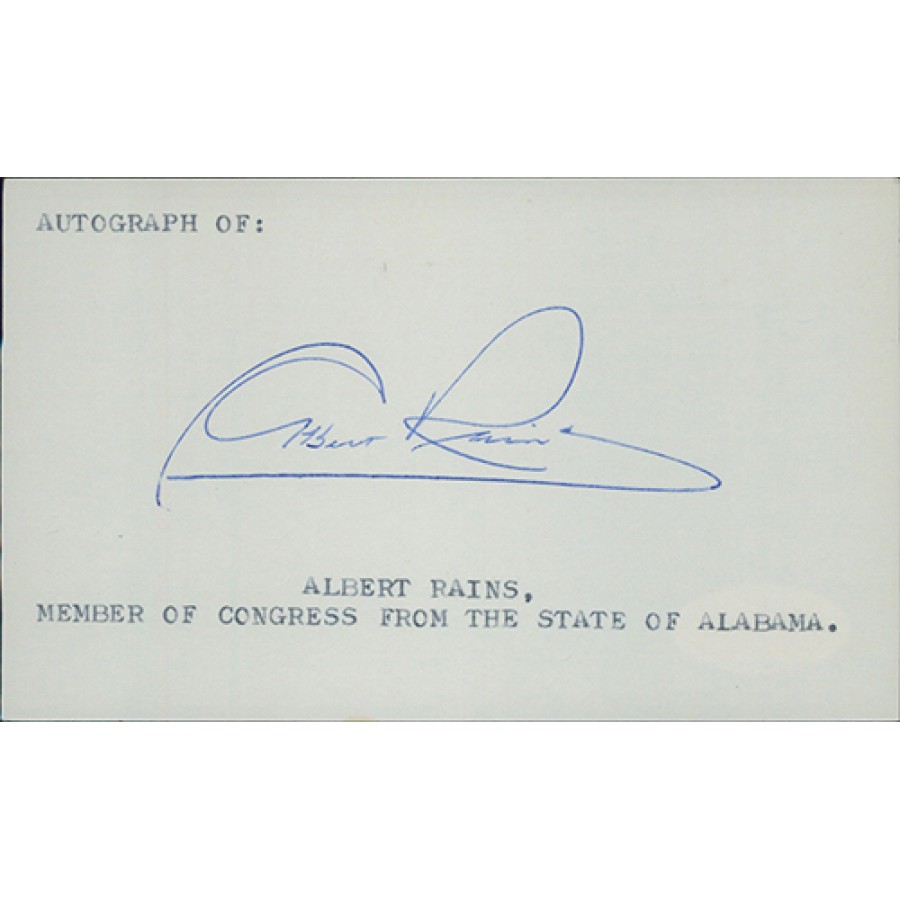 Signed Albert Rains 3x5 index card in blue ink. This item has been certified by James Spence Authentication (JSA) with sticker affixed to item and matching card.