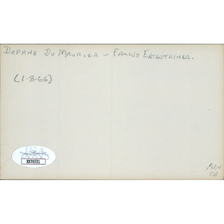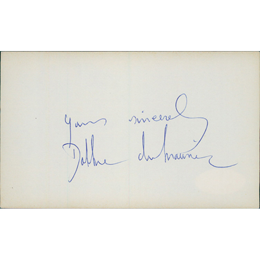 Signed Daphne du Maurier 3x5 index card in blue ink. This item has been certified by James Spence Authentication (JSA) with sticker affixed to item and matching letter of authenticity.