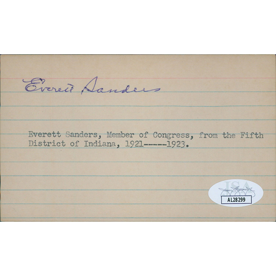 Everett Sanders Indiana Congressmen Signed 3x5 Index Card JSA Authenticated