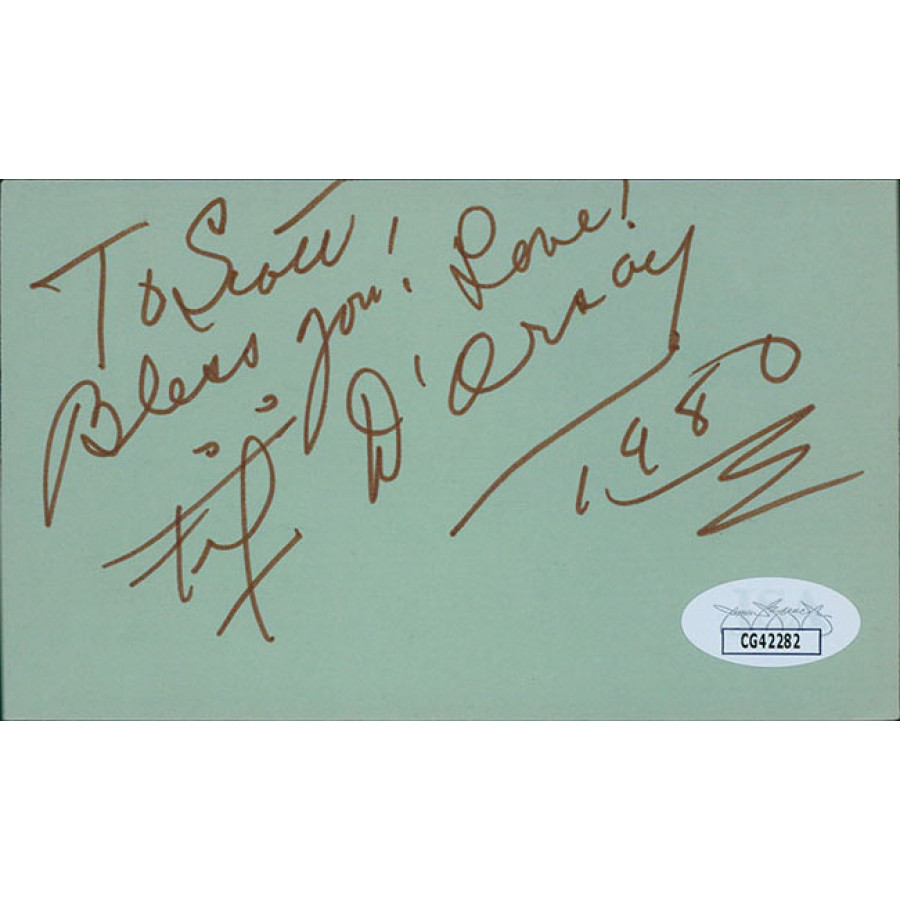 Signed Fifi D'Orsay 3x5 index card in black ink personalized. This item has been certified by James Spence Authentication (JSA) with sticker on item and matching card.
