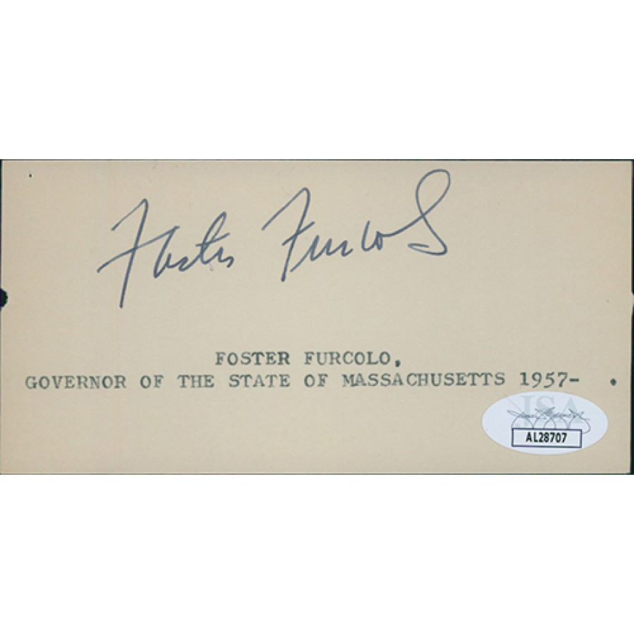Signed Foster Furcolo 2.5x5 index card in black ink. This item has been certified by James Spence Authentication (JSA) with sticker affixed to item and matching card.