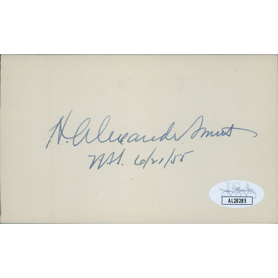 Signed H. Alexander Smith 3x5 index card in blue ink. This item has been certified by James Spence Authentication (JSA) with sticker affixed to item and matching card.