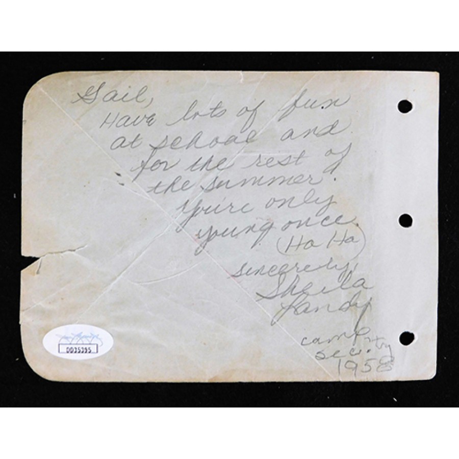 Signed Al Jolson 4.5x6 Album Page in black ink. This is also signed on the back side. There is some staining and a large rip through the left middle side of the page. This autograph has been certified by James Spence Authentication (JSA) with sticker on item and matching card.
