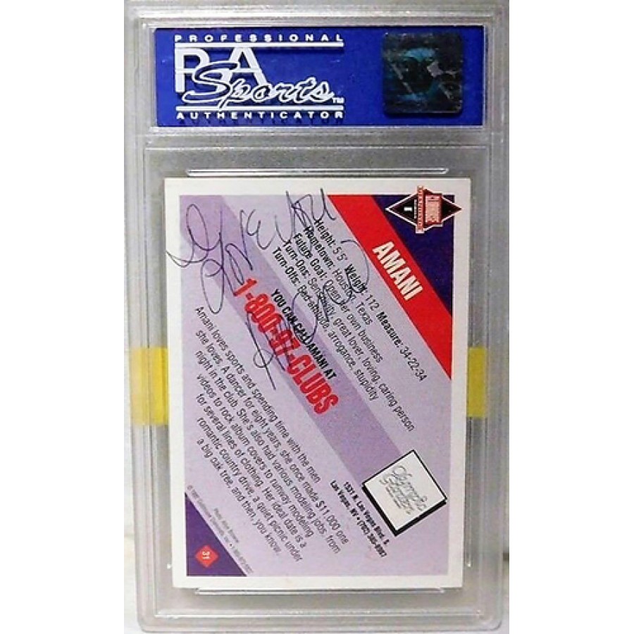 Amani signed 1992 Clubhouse Diamonds #31 nude promo card series 1 on the back of the card. The autograph has been authenticated by PSA Authentication encapsulated. There are some scratches and some dirt marks on the case.