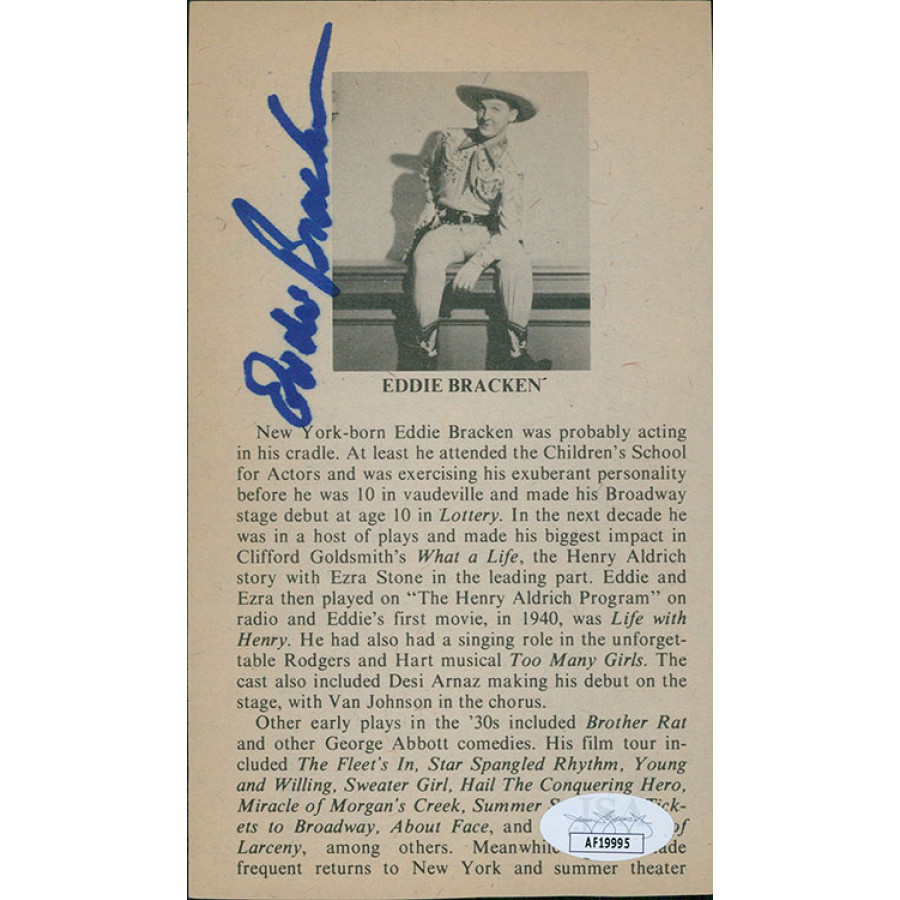 Signed Eddie Bracken 4x6.5 cut magazine page in blue sharpie. This item has been certified by James Spence Authentication (JSA) with sticker affixed to item and matching card.